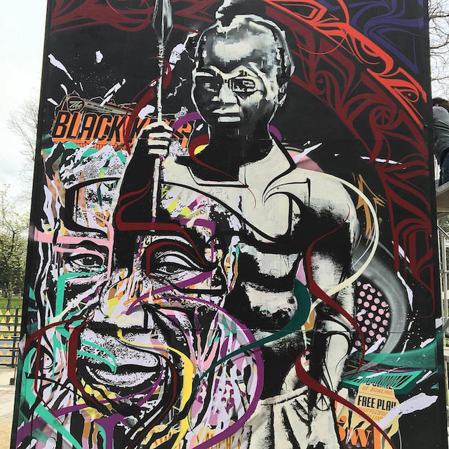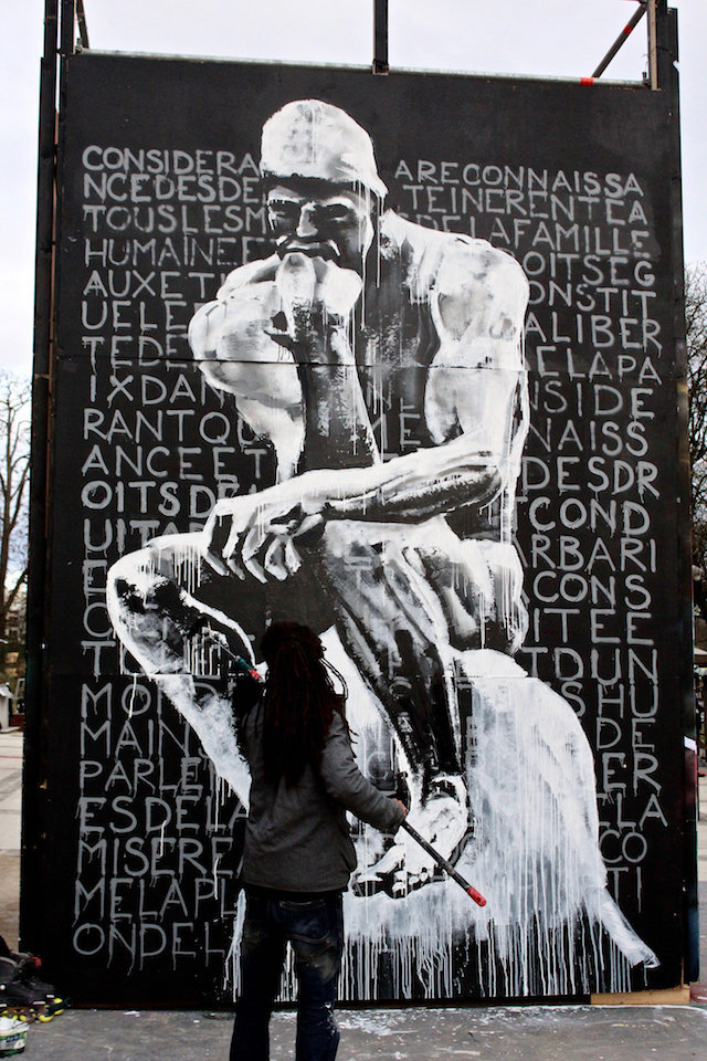 Il a choisi de peindre dans la rue avec l’idée d’un Art populaire et accessible à tous. En France l’art est enfermé et élitiste, contrairement à l’Afrique où l’art est partout. Il transpose donc cette vision africaine de l’art en le mettant dans la rue, pour tous.