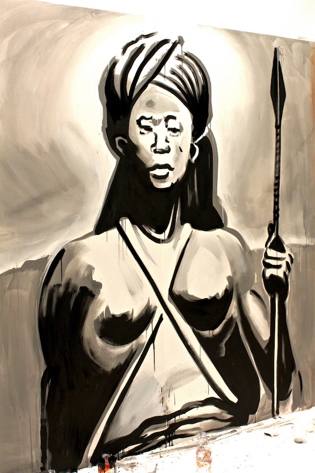 Il en a fait un guerrier pour interpeller le spectateur. En France personne ne sait ce que sont les bantous. Nous avons une vision très exotique et fantasmée de l’Afrique et de ces guerriers. En faisant irruption sur les murs de nos villes, ils font le lien entre le passé (les origines de l’Homme) et le monde moderne. Mais ce sont des guerriers « pacifistes » qui semblent nous inviter à prendre notre place dans l’espace public, tout comme le fait Kouka lorsqu’il intervient illégalement dans la rue.